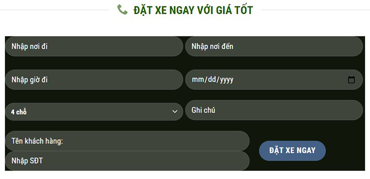 Quý khách nhập các thông tin vào bảng thông tin đặt xe, và lựa chọn loại xe và đặt xe. Ngay tức thì tổng đài của chúng tôi sẽ liên hệ đến Quý khách để xác nhận và lên lịch xe đưa đón.